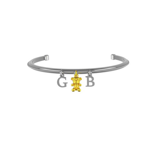 Bracciale rigido in argento con lettere personalizzabili e charm orsacchiotto in oro 9 carati