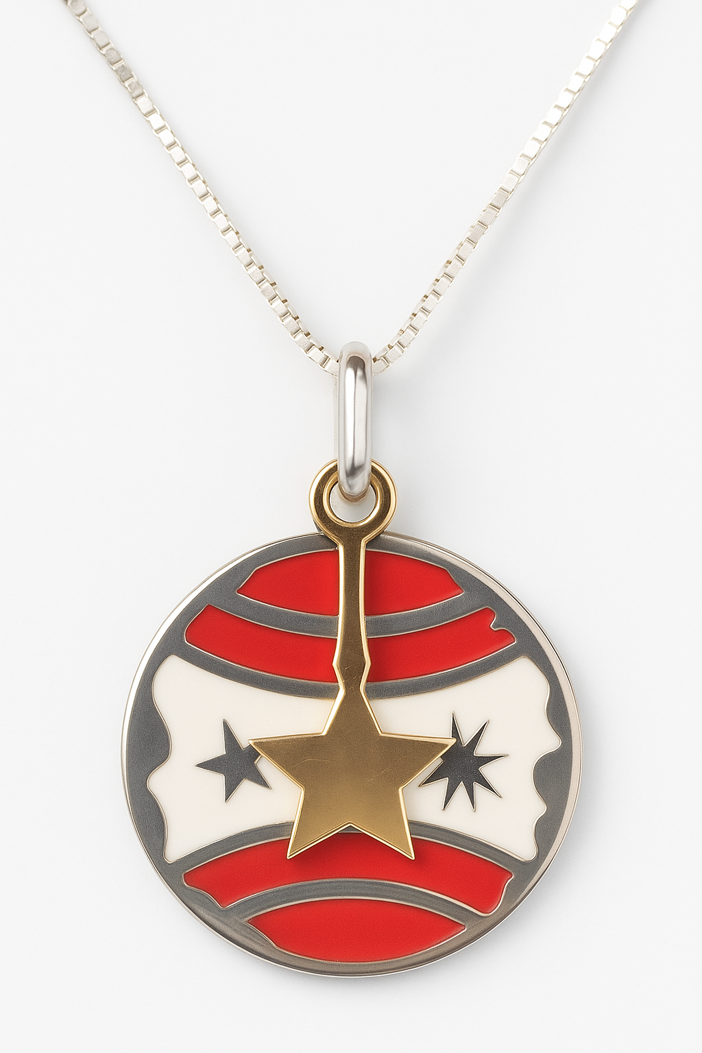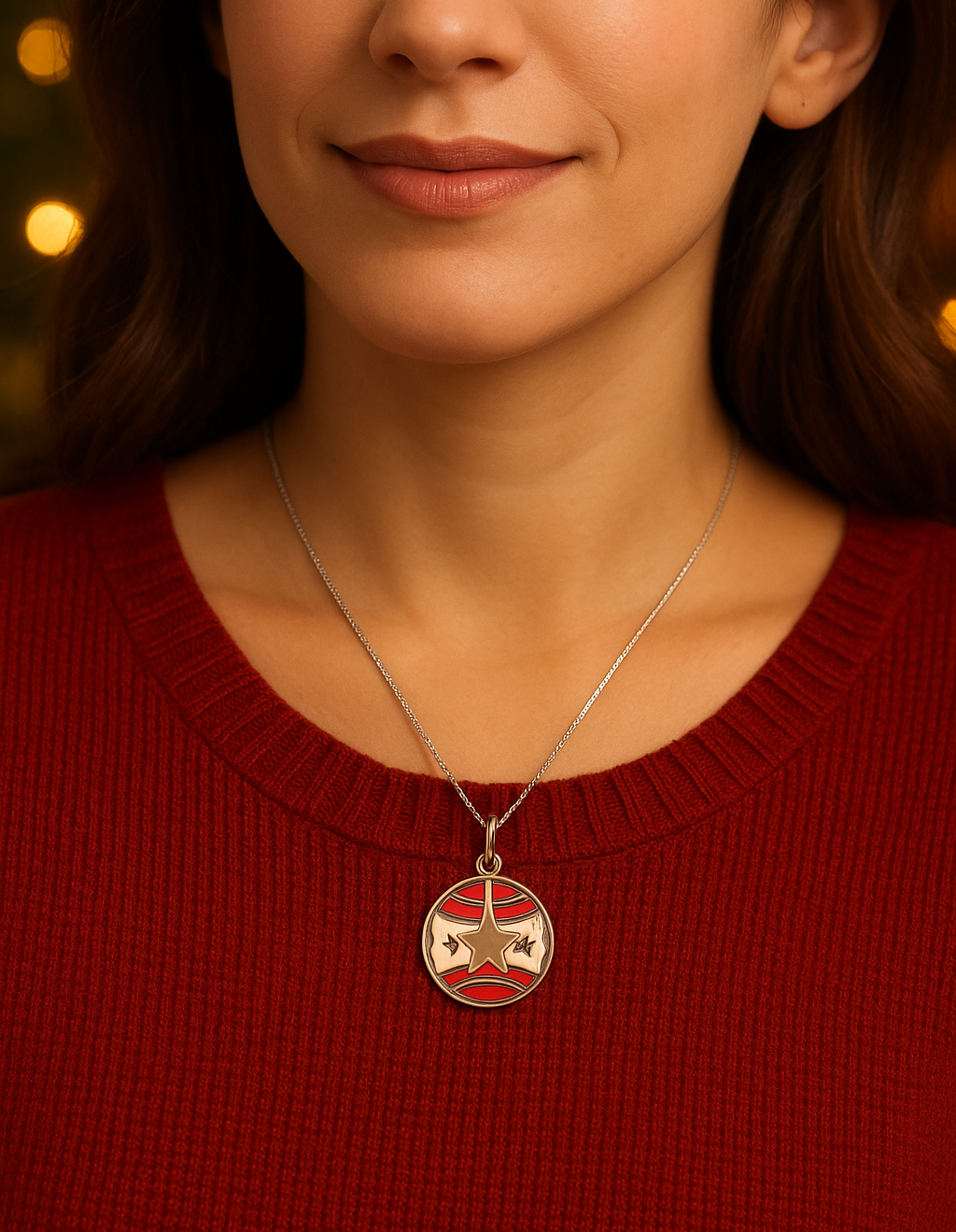 Un ciondolo tondo in argento 925 smaltato a fuoco, che racchiude la magia della neve di dicembre e il calore dell'oro. Il fiocco di neve bianco si stacca su un fondo rosso intenso, mentre l'abete dorato porta un tocco di speranza e rinascita.